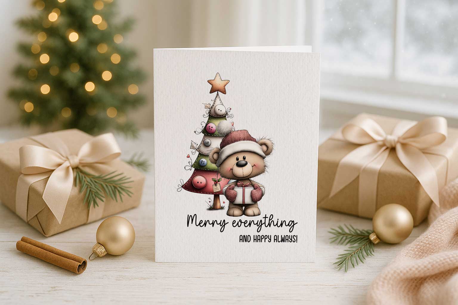 Take a step back and review your design. The combination of script and sans-serif in “Merry Everything” and "and happy always" should look harmonious and festive. The handwritten font brings warmth, and the sans-serif keeps it clear and modern. The text, bear, tree, and background together create a balanced composition.